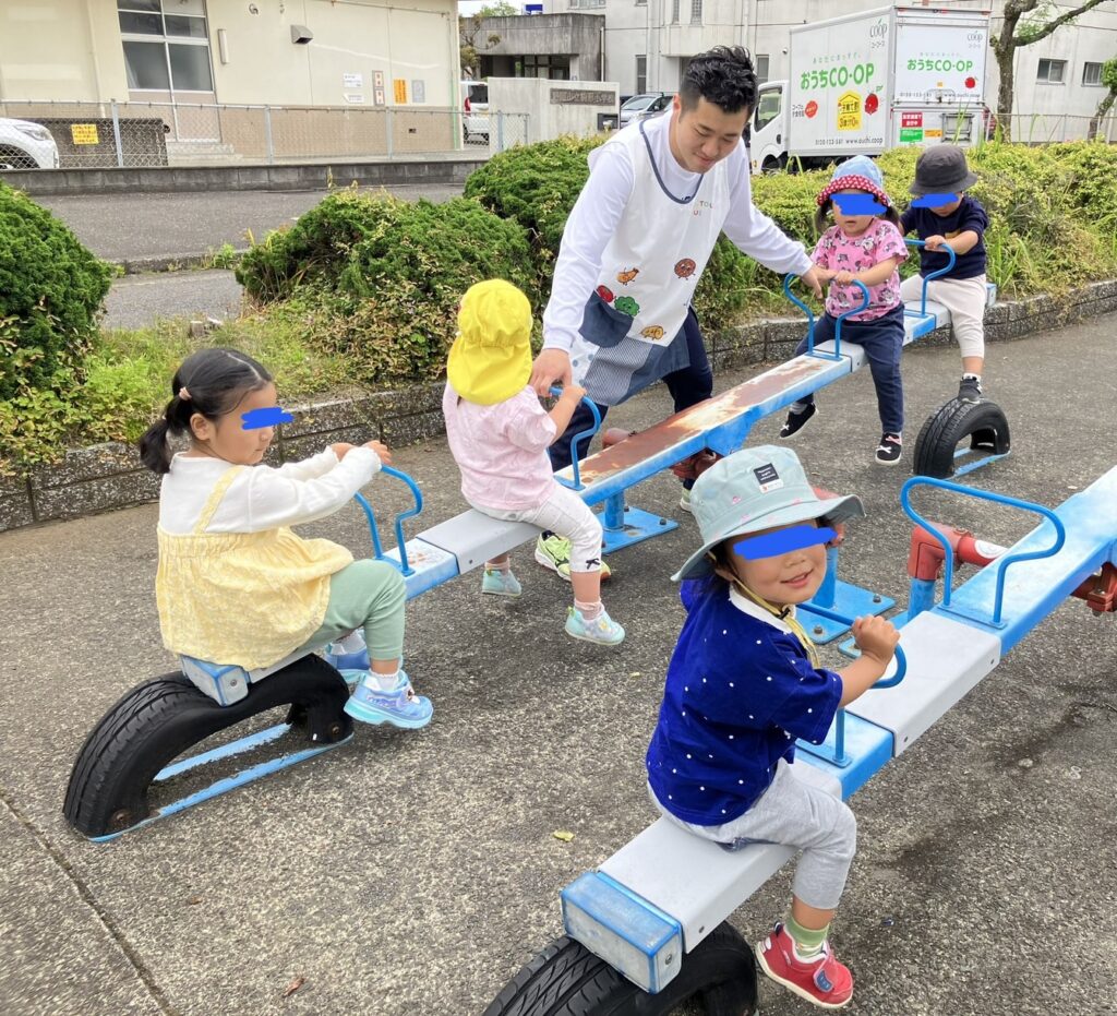 5月9日(金) シーソー楽しかったね! 2025.05.09 2歳児 今日は南安倍緑地のシーソーに友達みんなで乗りました。「面白いね」「楽しいね」と感想を口にする声が聞こえました。乗りながら歌っている子もいてみんな楽しそうでした!