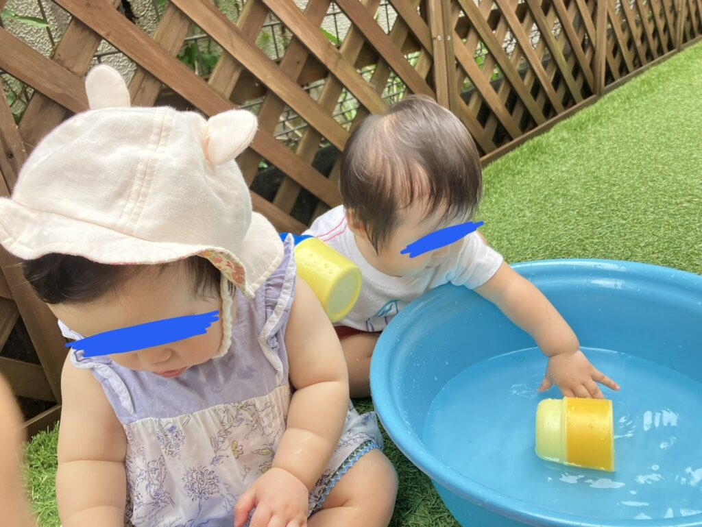 7月17日(木) 水遊び💧 2025.07.17 0歳児 新入児も水遊びをするようになりました。 自らタライの水に手を入れたり、保育者に水をかけてもらったりしてよく楽しんでいます♪ 入園当初に比べ、全体的に笑顔も増えてきました!