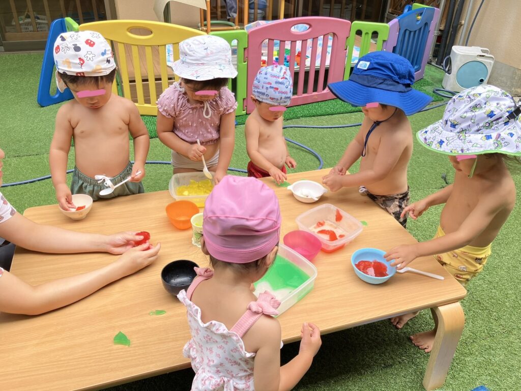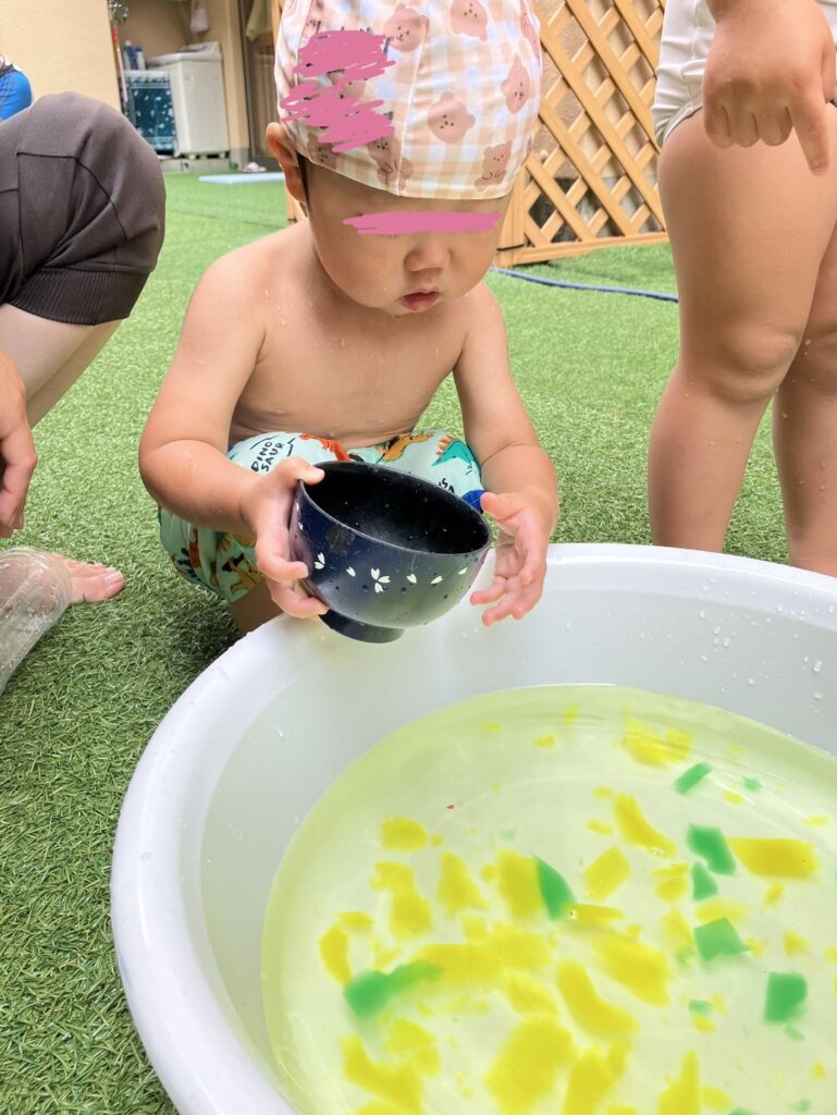 水の中に入れて浮いた寒天をすくったり、風船の中に寒天を詰めたりと、それぞれ遊びが広がっていました⭐︎