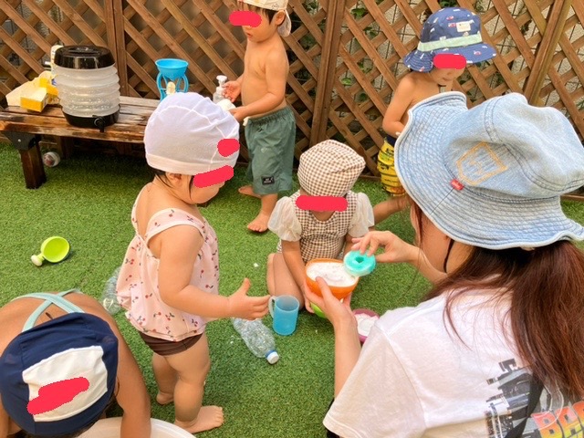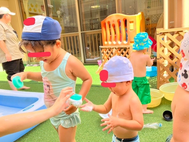 7月24日(木) あわあわドーナツ🫧 2025.07.24 1歳児 泡あそびをしました。ドーナツ型のスポンジに泡をつけると喜んで触っていた子どもたち🍩泡をサンドしたり、ディップしてみたりと思い思いに楽しんでいました♩ 水風船でもあそび、色々な感触を楽しみました✨
