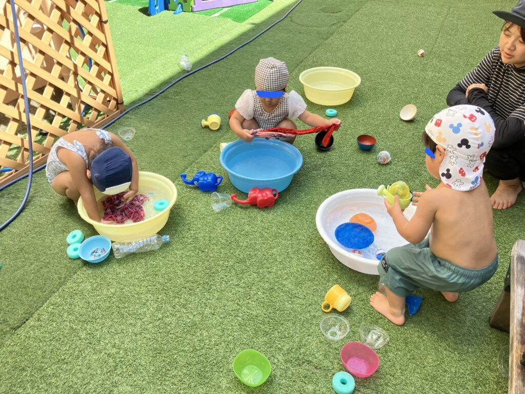 またバンダナをタライの中で洗ったり、干したりするお洗濯ごっこを楽しむ姿も見られました🫧