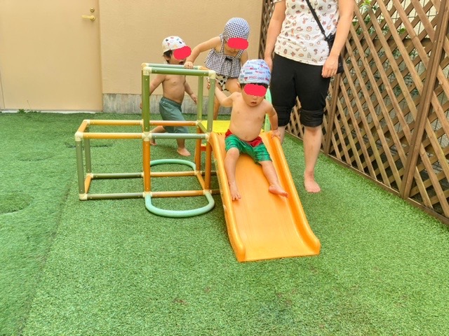 今日も元気いっぱい水遊びをしました。滑り台・ジャングルジムが好きな子は一目散に遊びに行っていました♩