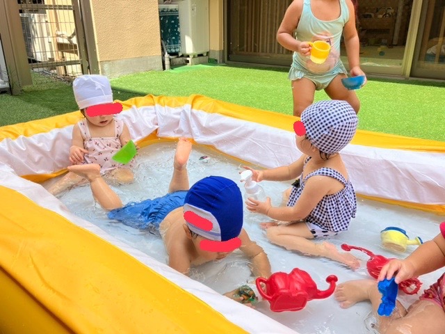 プールでは、うつ伏せになり泳ぐようにしながらゆったり楽しむ子もいました✨時々お友達同士で水をバシャバシャ掛け合い、ニコニコの笑顔が見られました😊