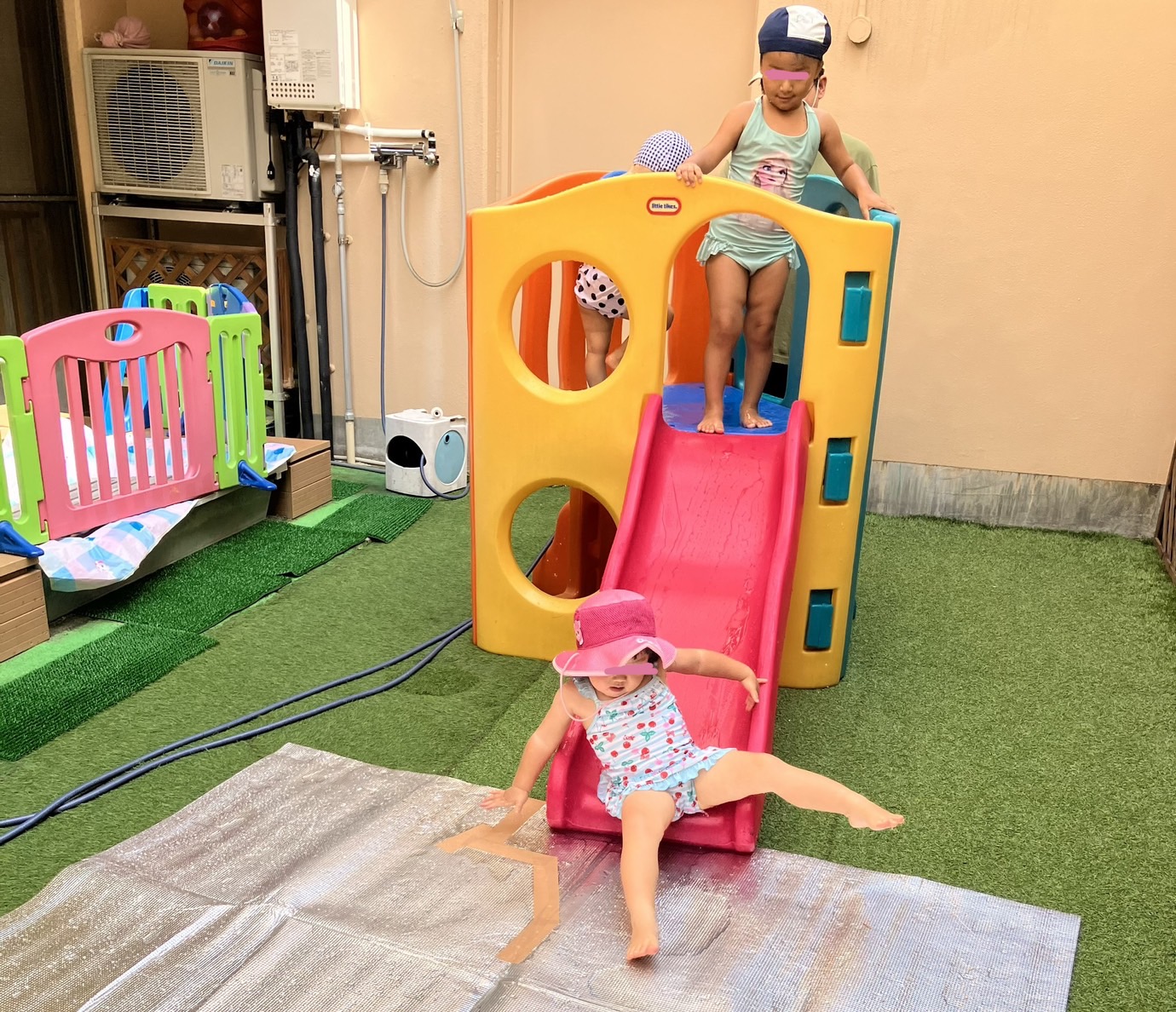 滑り台に水を流して、ウォータースライダーのようにして遊びました。