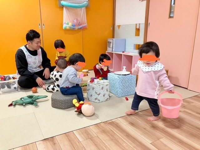 ままごとはミニペットボトルをコップに注いで飲む真似やスプーンでぬいぐるみに食べさせてあげる子もいました。