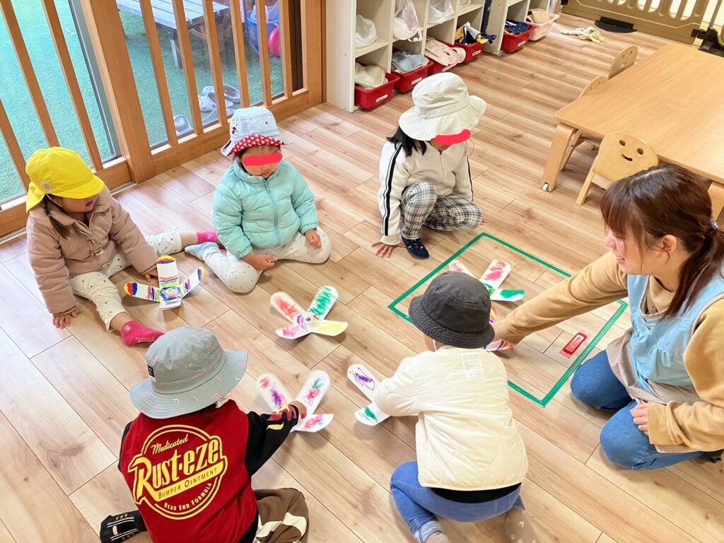 コマ回し 2026.01.22 1月22日(木)2歳児 昨日、作ったコマをみんなで回してあそびました。 子どもの手でも簡単に回るので、「見てー!〇〇のキレイだよ!」「一番早いよ!」と何度も回して見せてくれました。