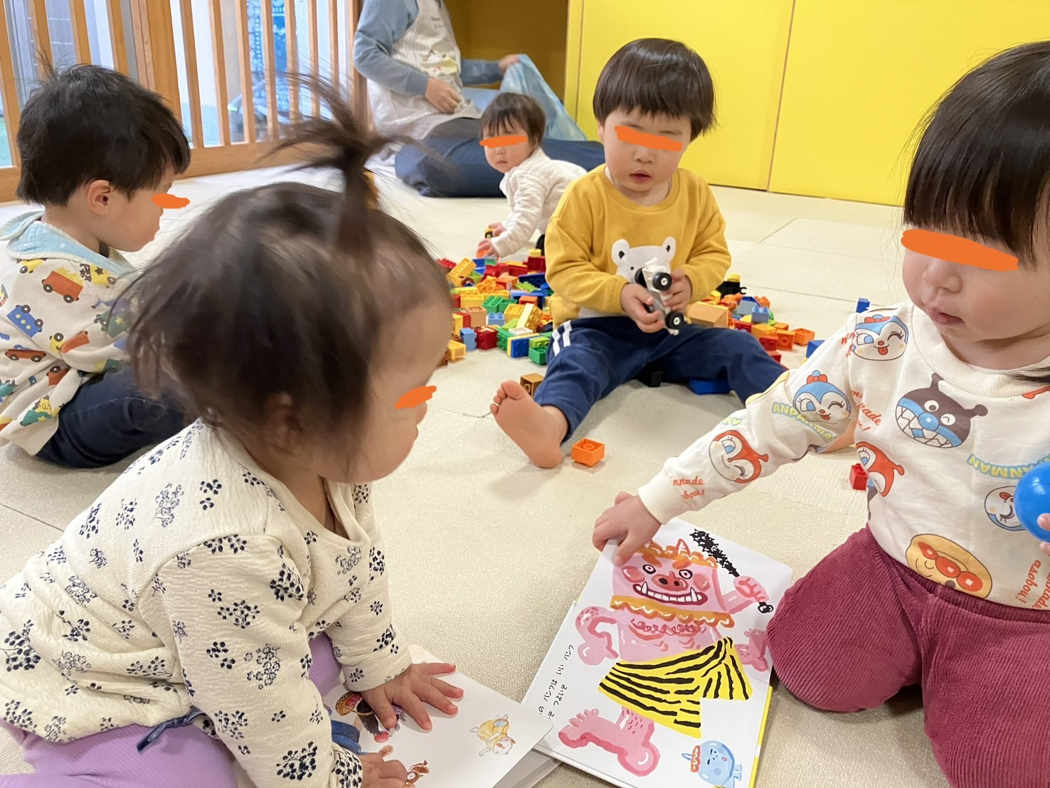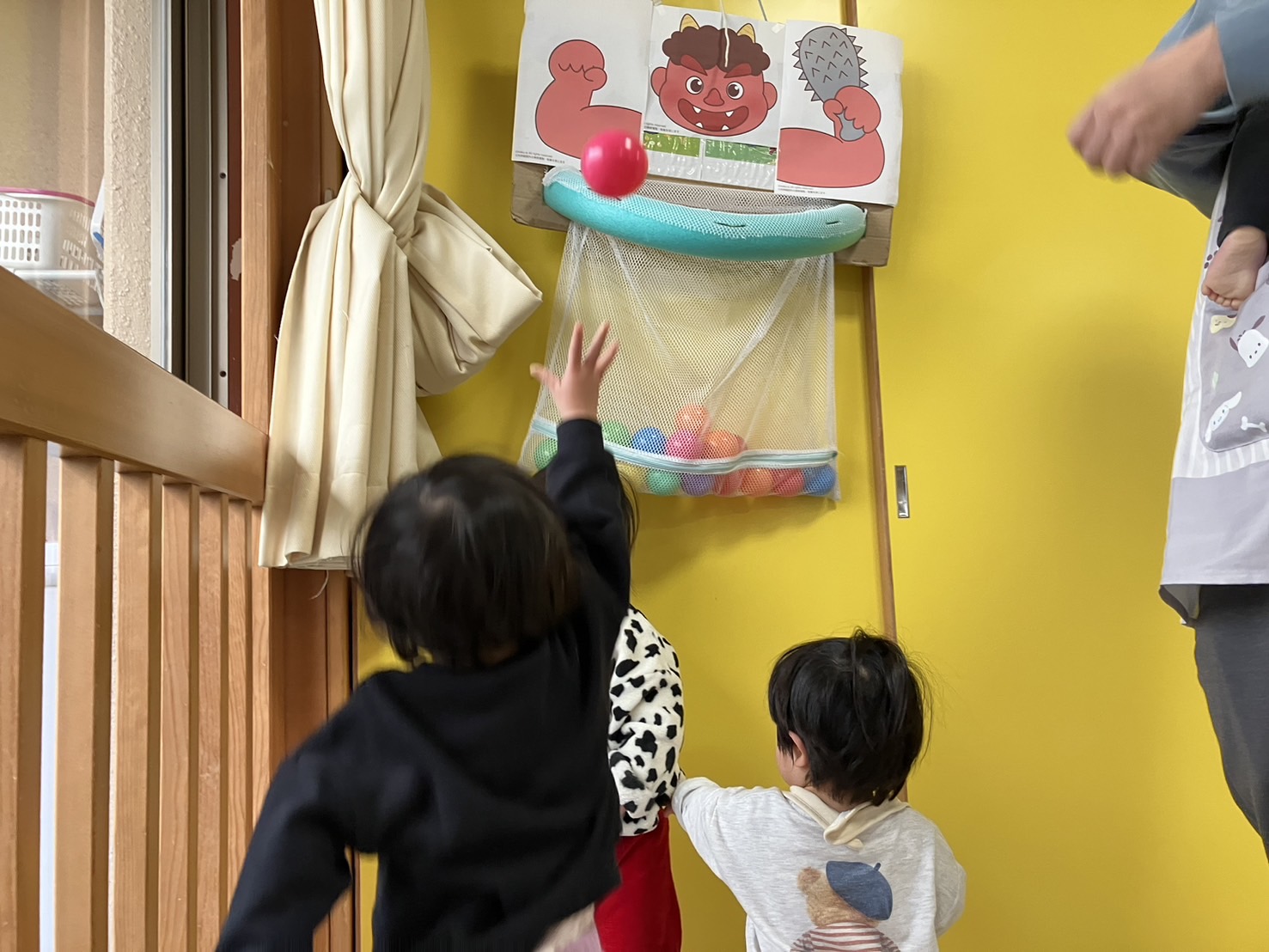 もうすぐ節分だね! 2026.01.26 1/26(月)一歳児 今日は鬼の顔が描いてある的当てを出しました。登園するとすぐに気づき、「おに、みて」と指差しながら子ども達同士でお話をしていて可愛かったです😊 他にもおにのパンツの絵本を読んだり、的当てを楽しんでいました♪