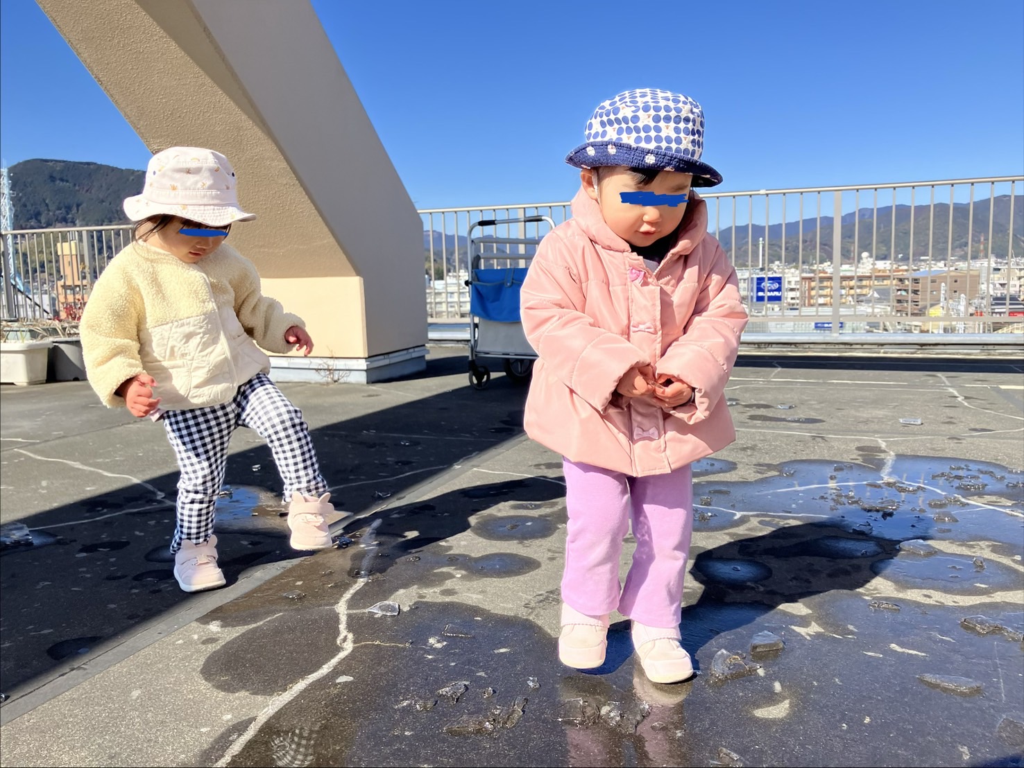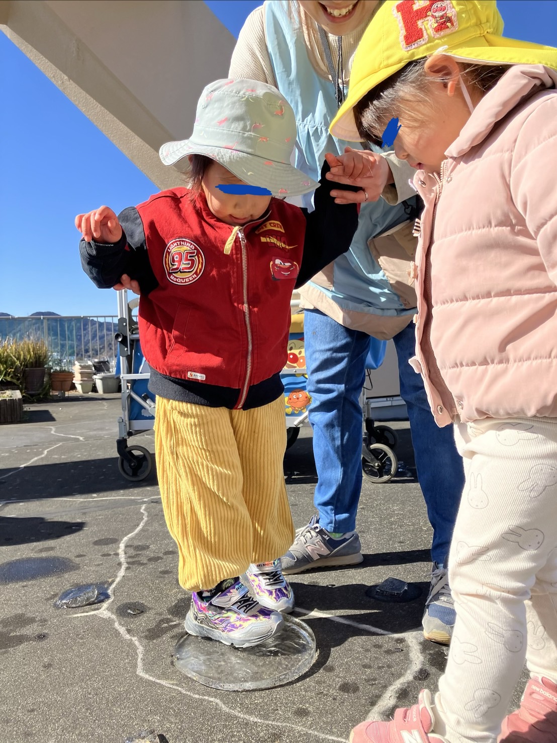 今日は屋上へ行き氷を触りました。初めは氷の冷たさに驚いていた子ども達ですが、次第に慣れて「冷たーい!」と氷を持って見たり、靴で踏み氷が割れる様子を楽しんでいました♪