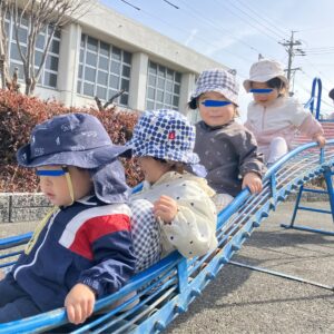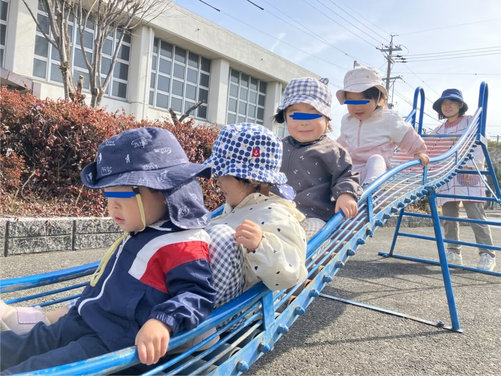 緑地へ行ったよ! 2026.02.24 2月24日(火)一歳児 今日は緑地へ遊びに行きました。滑り台をとても仲良く滑れており、友達が階段を登っている際もしっかりと待つ事が出来ていました☺️ また、ギコギコと揺れるシーソーを友達と嬉しそうに乗る姿もありました✨