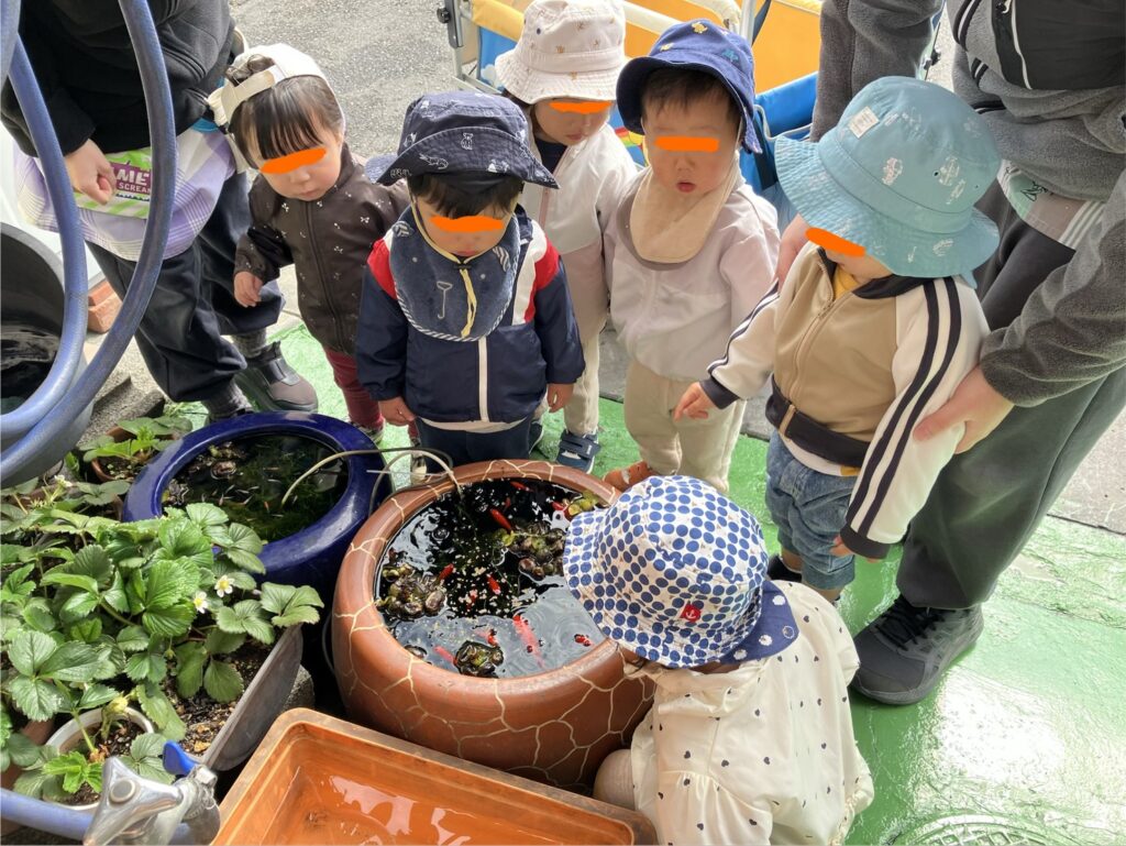 保育園の周りをお散歩 2026.03.11 3月11日(水) 1歳児 今日は保育園の周りをお散歩しました。 地域の方が子ども達に、金魚の餌やりをさせてくれました。 皆目をキラキラさせて嬉しそうに餌をあげていました♪ 中には口をすぼめて金魚の口の真似をする子もいました😊