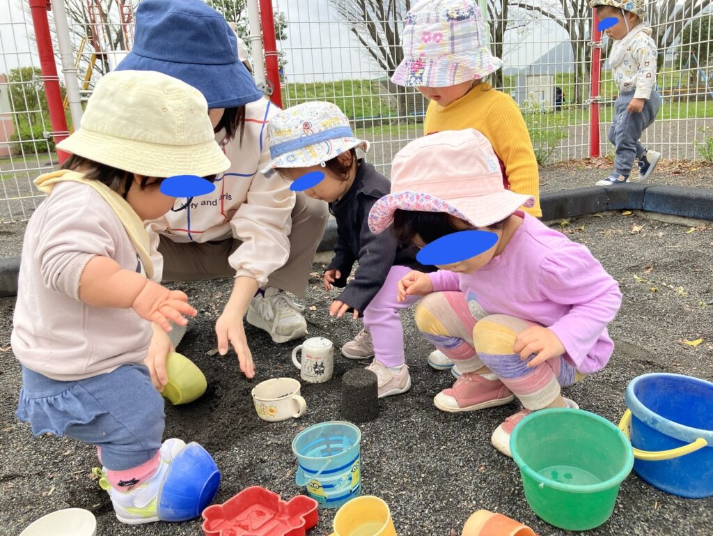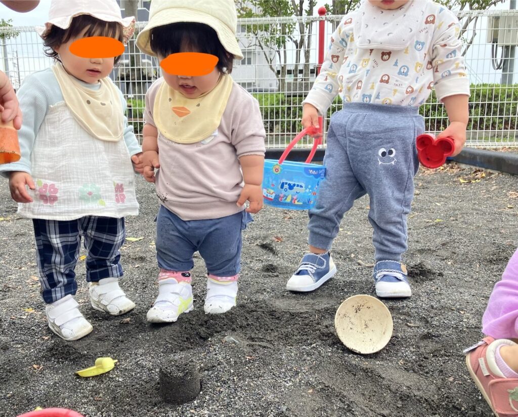 新年度スタート♪ 2026.04.01 4月1日(水) 1歳児,2歳児 今日から新年度が始まりました。新しい環境になり、ワクワクドキドキな子ども達! 1,2歳児は南安倍公園の砂場で遊びました。 玩具を使って、思い思いに砂遊びを楽しんでいました✨